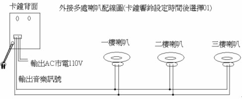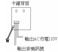 壹﹒外接音樂訊號輸出--------------卡鐘響鈴設定時間後選擇01:音樂輸出;同時卡鐘內部喇叭也會響。
